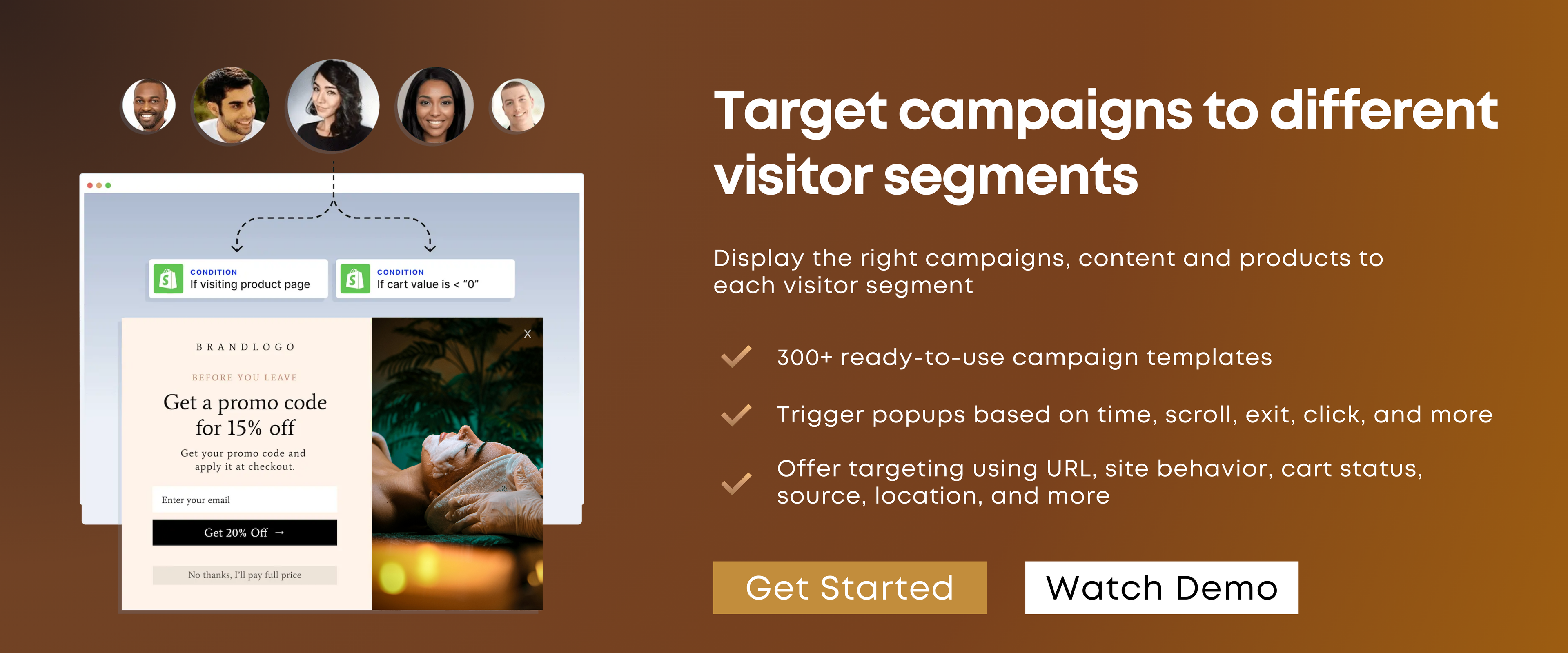 With 300+ ready-to-use campaign templates, you can create customized offers based on visitor behavior, page activity, cart value, traffic source, location, and more.